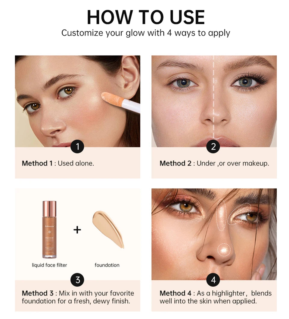 - 3. Mezclado con tu base: Combínalo con tu base favorita para un acabado fresco y radiante que dura todo el día.